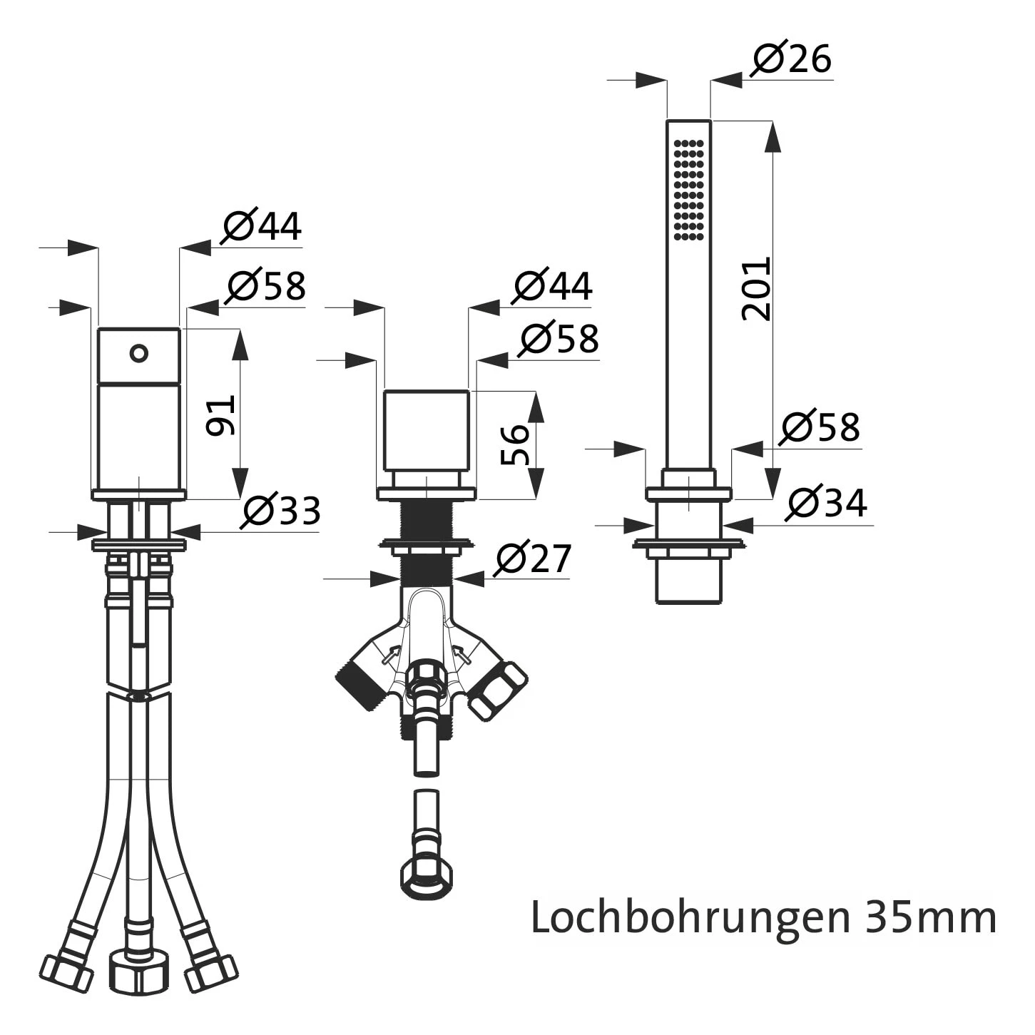 Herzbach DEEP Dreiloch-Wannenarmatur mit Stabhandbrause Kunststoff