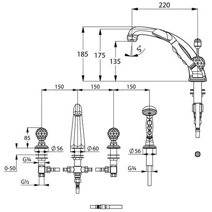 Kludi 1926 4-Loch-Wannenfüll- und Brausearmatur für Fliesenrandmontage mit Kristallgriffe